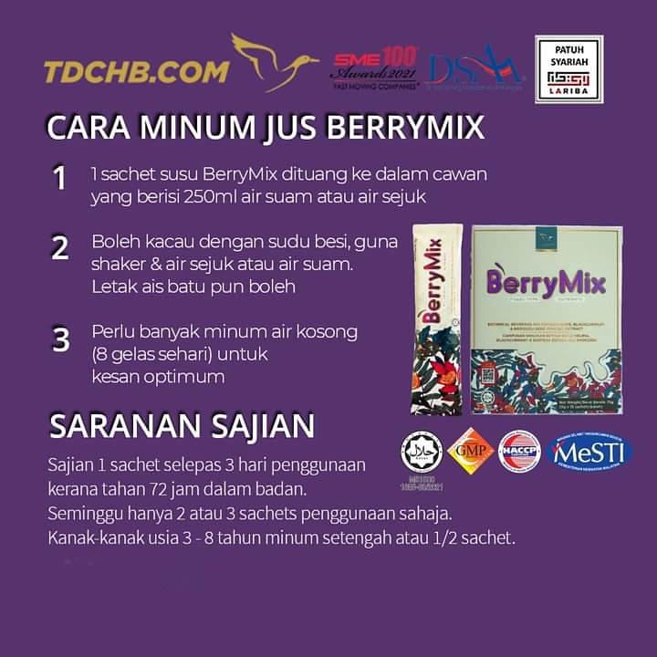 ✅ Campurkan 1 Sachet BerryMix dengan 250ML-300ML air sejuk/suam,kacau sehingga larut dan sedia utk diminum.